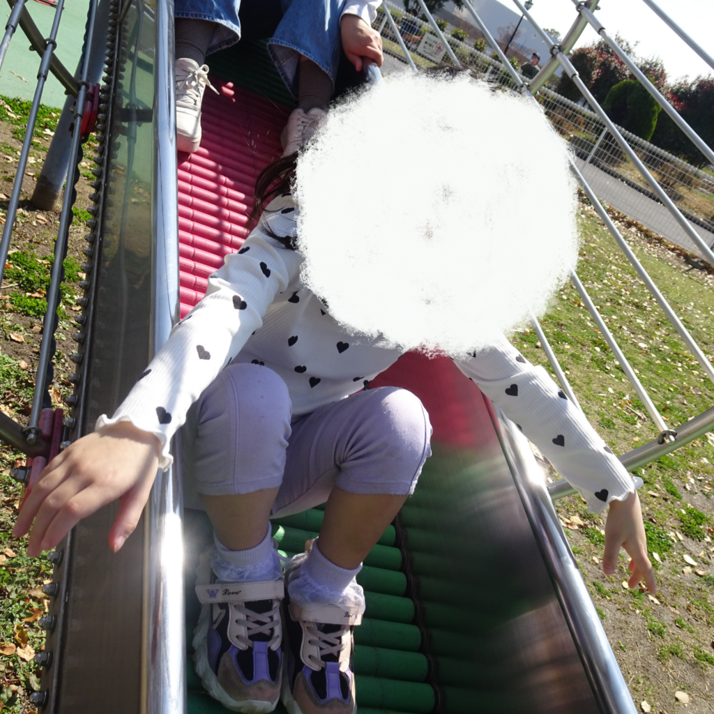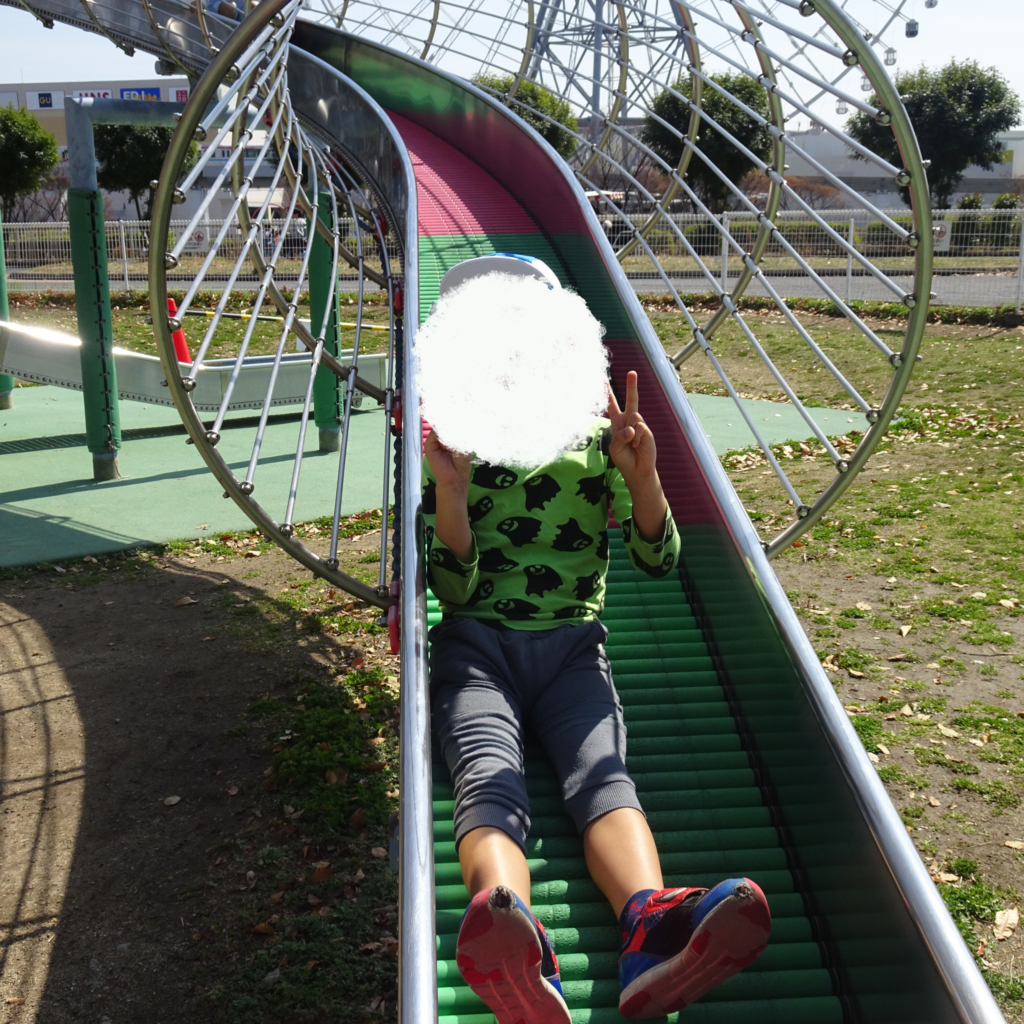 高い所から勢いよく滑ってすごく楽しんでいました。